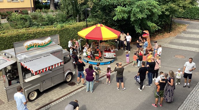 Das Gelände verwandelte sich in eine fröhliche Spieloase, in der die Kinder sich am Glücksrad versuchen konnten, das mit tollen Preisen lockte. Das Kinderkarussell drehte fröhlich seine Runden und sorgte für strahlende Gesichter bei den Kleinen. Für unvergessliche Erinnerungen stand eine Fotobox bereit, in der Familien und Freunde gemeinsam posierten. Spannend wurde es bei der Schatzsuche, die die kleinen Entdecker:innen auf Trab hielt, während Geschicklichkeit und Mut beim Dosenwerfen sowie in den Fühlboxen gefragt waren – auch die ganz Mutigen hatten hier ihren Spaß. Darüber hinaus gab es viele weitere Spiele und Mitmachaktionen, die das Programm abrundeten.