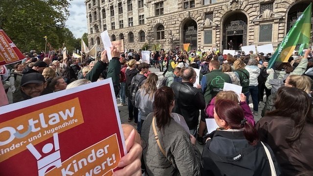 Am 24. September 2025 versammelten sich rund 1.000 Menschen vor dem Leipziger Rathaus, um gegen drohende Kürzungen im Kita- und Hortbereich zu protestieren. Mit dabei: Mitarbeiter:innen von Outlaw und engagierte Familien, die ihre Kinder in Outlaw Kitas betreuen lassen. Zentrales Anliegen der Aktion war die Übergabe einer Unterschriftenliste an die Stadt Leipzig - mit insgesamt rund 10.000 Unterschriften!
