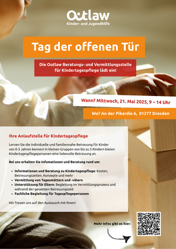 Unsere Beratungs- und Vermittlungsstelle für Kindertagespflege in Dresden lädt von 9:00 bis 14:00 Uhr zum Tag der offenen Tür ein. Interessierte erhalten dort umfassende Informationen und Beratung rund um die Kindertagespflege – von Kosten, Betreuungszeiten und Konzepten bis hin zur konkreten Vermittlung geeigneter Tagesmütter und -väter. Der Tag bietet eine gute Gelegenheit, mit dem Team ins Gespräch zu kommen, Fragen zu stellen und die Strukturen hinter der Kindertagespflege kennenzulernen.