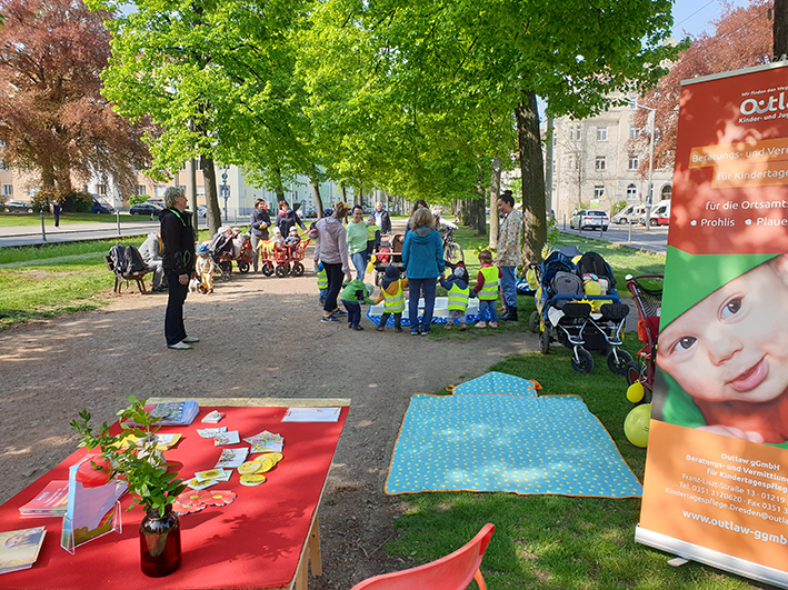Am Infostand der Outlaw Beratungs- und Vermittlungsstelle für Kindertagespflege Dresden konnten sich Passant:innen, Familien und Interessierte vor Ort beraten lassen oder direkt mit Kindertagespflegepersonen ins Gespräch kommen.