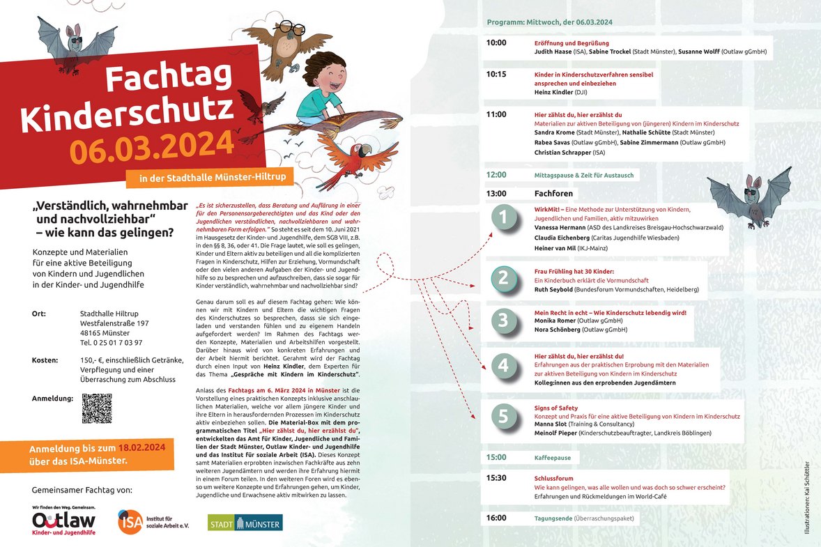 Ab sofort können sich alle Interessierten für den Fachtag Kinderschutz „Verständlich, wahrnehmbar und nachvollziehbar“ – wie kann das gelingen?" am 6. März in der Stadthalle Münster-Hiltrup anmelden. Im Fokus stehen Konzepte und Materialien für eine aktive Beteiligung von Kindern und Jugendlichen in der Kinder- und Jugendhilfe. Der Fachtag wird gemeinsam veranstaltet von der Outlaw gGmbH, der Stadt Münster und ISA – Institut für soziale Arbeit e.V.