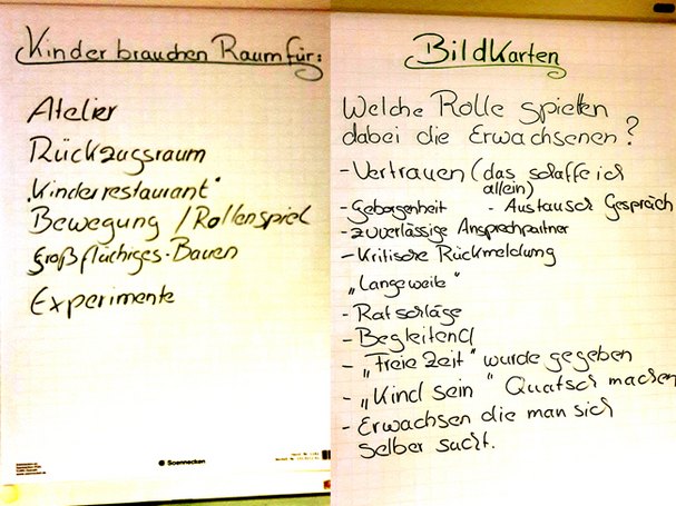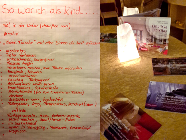 Den großen Saal hatten sie mit einer Materialaustellung, Kerzen und Getränken vorbereitet. Zu Beginn baten sie die Eltern ihre Bedenken und mögliche Fragen auf Kärtchen zu schreiben, auf die sie im Laufe des Abends eingingen. Gemeinsam reflektierten sie mit den Eltern wie sie als Kinder waren, was sie besonders gerne gespielt haben und welche Rolle die Erwachsenen dabei gespielt haben. Die Reflexion ihrer eigenen Kindheit half den Eltern in Laufe des Abends leichter nachvollziehen, weshalb sich die Kita für diesen Weg entschieden hat.