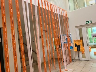 Der Schlüssel zum Erfolg: Kreativität! In unserer Kita Am Maselakepark schmücken die Mitarbeiter:innen den Eingangsbereich mit orangenen Luftballons, basteln Plakate und verwandeln das Absperrband mit dem Statement "Auf die Kleinen kommt es an" in knallige Türvorhänge.