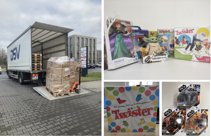 Die Spielwaren wurden und werden noch vor Ort an unsere Einrichtungen verteilt und kommen damit vielen Kindern und Jugendlichen zugute. Unter den Spielzeugen befinden sich StarWars Figuren und singende Eiskönigin-Puppen, aber auch Gesellschaftsspiele wie Twister, Dr. Bibber oder 4-gewinnt – es ist also für jede:n etwas dabei. Sowohl in Dresden als auch in Münster holten bereits Kolleg:innen die gespendeten Spielzeuge für unsere Einrichtungen ab.