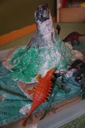 In den folgenden Tagen wurde in allen Gruppen mit großer Neugier und viel Engagement zum Thema Dinosaurier gearbeitet. Die Kinder bastelten Dino-Eier aus Salzteig, bemalten Gipsfiguren und gestalteten fantasievolle Landschaften, in denen ihre mitgebrachten Dinosaurier lebendig wurden. Auch mit Lego entstanden kreative Dino-Welten. Neben all den Bastelaktionen wurde auch geforscht und experimentiert. Die Kinder legten Zeitleisten, um zu verstehen, wann die Dinosaurier lebten, und führten spannende Vulkan-Experimente durch. Beim Vermessen von Dino-Figuren wurde deutlich, wie groß ein Brachiosaurus wirklich war und beim Backen von Dino-Plätzchen kam auch der Spaß in der Küche nicht zu kurz. Ein besonderes Highlight war das Dino-Yoga, das speziell für die Vorschulkinder angeboten wurde und Bewegung mit dem Thema verknüpfte.