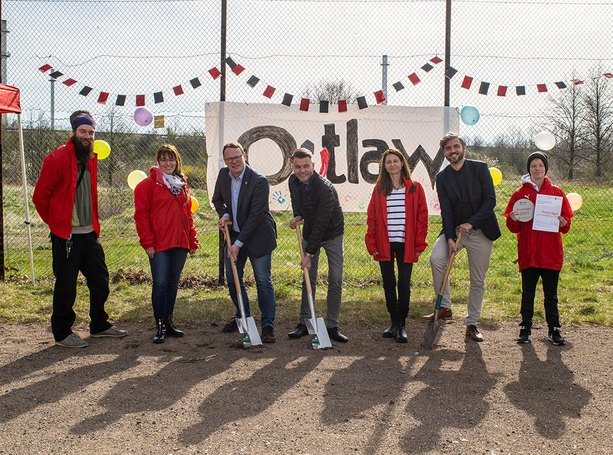 Zum ersten Spatenstich trafen sich am 12. April Stefan Sári, Amtsleiter des Kreisjugendamts im Landkreis Meißen, Dr. Mirko Pollmer, Bürgermeister von Zeithain, Stephan Liebegall, Gesamtleiter Outlaw am Standort Meißen, Tobias Glöckner, Projektleiter Quartier 36 Nikopol, bei Outlaw.