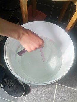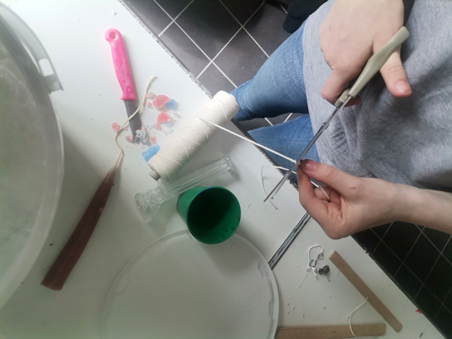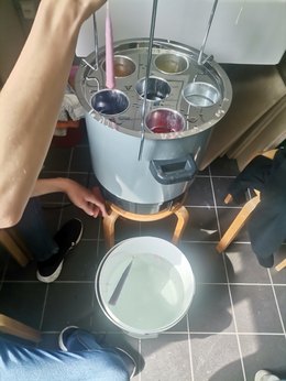 Zwischen 60 und 80 Grad braucht es, um die verschiedenfarbigen Wachssorten Sojawachs und Bienenwachs zu schmelzen. "Da es das erste Mal war und die Tauchstation noch nie gebraucht wurde, waren alle sehr gespannt", erzählt Pauline Peglau und führt weiter aus: "Die Vorbereitungszeit ist sehr lang, leider nicht für den spontanen Alltag gedacht. Die Tauchstation braucht bis zu 2 Stunden bis sie richtig heiß wird und das Wachs geschmolzen ist."