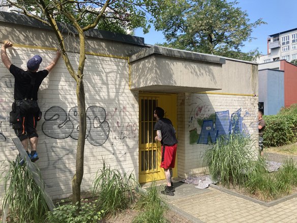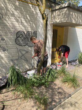 Am 8. Juni 2023 fand in der Berliner Outlaw-Kita Waldshuter Zeile eine ganz besondere Verschönerungs-Aktion statt: Vier Mitarbeiter:innen von Aroundhome, einer Empfehlungsplattform für Eigenheimbesitzer:innen, standen der Kita im Rahmen der Social Days tatkräftig zur Seite. Einmal im Jahr engagieren sich die Mitarbeiter:innen der Firma, deren Sitz sich am Potsdamer Platz befindet, ehrenamtlich in Berliner Einrichtungen. Mehrere Mitarbeiter:innen waren im Rollberge-Kiez unterwegs, sodass viele Träger an der Aktion teilnehmen und diverse Verschönerungsmaßnahmen stattfinden konnten. Dank der Vermittlung durch Bettina Jungmann, Projektleiterim im Stadtteilzentrum Rollbergesiedlung, konnte auch die Kita Waldshuter Zeile davon profitieren.