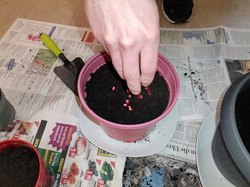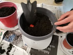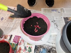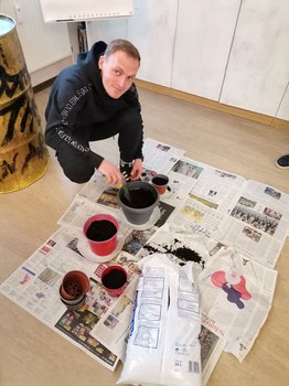 Die Töpfe und die Erde waren bereits im Jugendfreizeitzentrum vorhanden. Da es draußen stark regnete, musste die Einpflanzaktion drinnen stattfinden. Im Gruppenraum legten sie den Boden mit Zeitungen aus, um den Boden nicht zu beschmutzen. Dann ging es mit dem Einpflanzen los! Ein Jugendlicher bewies dabei einen sehr grünen Daumen, da er zu Hause auch gerne mit der Familie im Garten arbeitet.