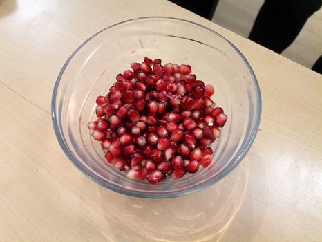 In diesem mussten die Experimentierfreudigen nun als erstes das Obst einkaufen: Dazu wählten sie Erdbeeren, Bananen, Weintrauben und Granatäpfel aus, die sie im Jotti entsprechend eines Experimentes unterschiedlich präparierten. Zum Einen entkernten sie das Obst so gut es ging und zum Anderen schnitten sie das Obst in kleine feine Stücke. Bei der Erdbeere reiht sich zum Beispiel eine kleine, gelbgrüne Nuss neben der anderen auf dem roten sogenannten Fruchtboden, deshalb zählen Erdbeeren botanisch gesehen auch nicht als Beeren sondern gelten als Sammelnussfrüchte. Auch anderes Wissenswertes erfuhren die Jugendlichen. Ein Mädchen machte eine etwas bittere Bekanntschaft mit dem ihr unbekannten Granatapfel:"Diese Äpfel wachsen nicht bei uns im Garten und der schmeckt auch gar nicht so gut."