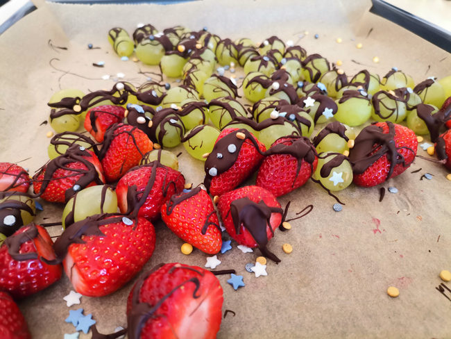 Nach getaner Arbeit belohnte sich die Gruppe kulinarisch und verarbeitete das übriggebliebene Obst zu Schokoladenobst – so wie man es auf dem Jahrmarkt schlemmen kann.