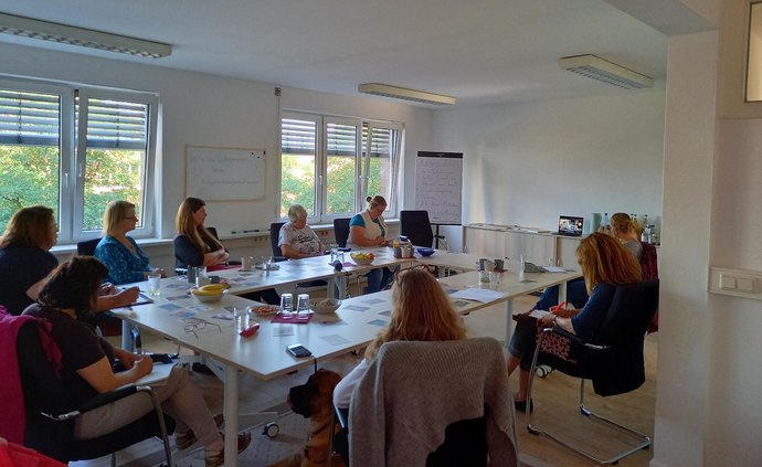 „Sieben Kooperationspartnerinnen kamen nach Bremen in unsere neuen Büroräume, während vier per Video dazu geschaltet waren“, berichtet Daniela Gröne-Herden. „Das hat sehr gut geklappt und ermöglicht nun auch Pädagog*innen, die keine Möglichkeit einer anderweitigen Kinderbetreuung haben und solchen, die sehr ländlich und weit entfernt wohnen, an den Treffen teilzunehmen.“