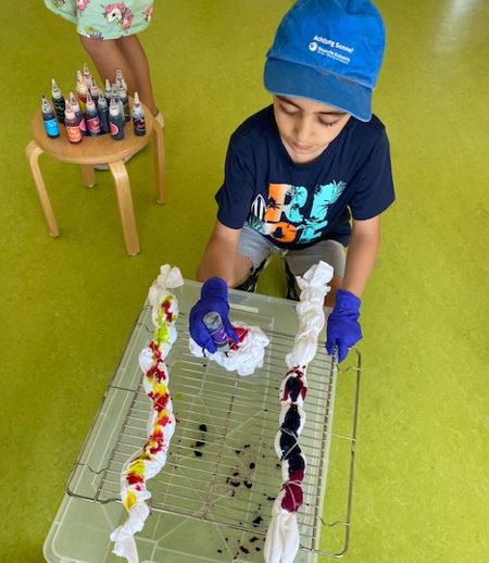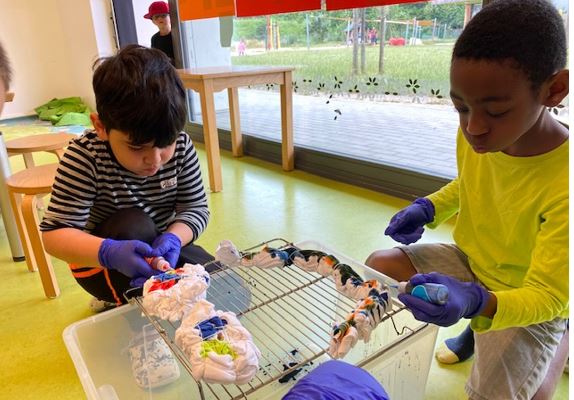 Vor dem eigentlichen Färben mussten die T-Shirts zusammengebunden werden, damit die Farbe einen bestimmten Effekt hinterlässt. Es gab große und kleine Wirbel und Streifen in horizontaler oder vertikaler Ausrichtung. Nach dem Zusammenbinden legten die Mädchen und Jungen los und ließen ihrer Kreativität freien Lauf: Aus 28 unterschiedlichen Farben wählten sie die schönsten aus und tropften sie auf ihr Shirt. Dann hieß es: warten! Einen Tag lang mussten die Farben einwirken.