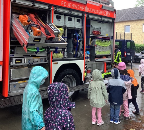 Ganz schön toll, was da alles in einem Feuerwehrauto zu finden ist - staunend begutachteten die Kids der Kita Uppenberg am 17. Mai die Ausrüstung der Freiwilligen Feuerwehr Münster, die in die Kita gekommen war. Die Feuerwehrleute erklärten viel und beantworteten alle Fragen. Die Kinder durften sogar einen Helm anprobieren und sich an einer kleinen Wasserspritze ausprobieren. Bei dem Besuch lernten sie viel und waren ganz fasziniert von den vielen Gerätschaften. Die Kita bedankt sich ganz herzlich für den schönen und informativen Nachmittag.