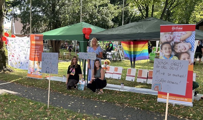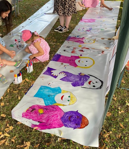 Unsere Kolleg:innen vor Ort gestalteten mit allen Besucher:innen ein Friedensbanner: „Wir möchten damit verdeutlichen, dass wir alle gleich sind und es keinen Unterscheid macht, welche Hautfarbe, Herkunft oder Geschlecht man hat“, betont Ramona Thünemann, Einrichtungsleitung der Kita Moosstiege. Das Banner wird nun am Rathaus aufgehängt und später die Zäune beider Kitas schmücken.