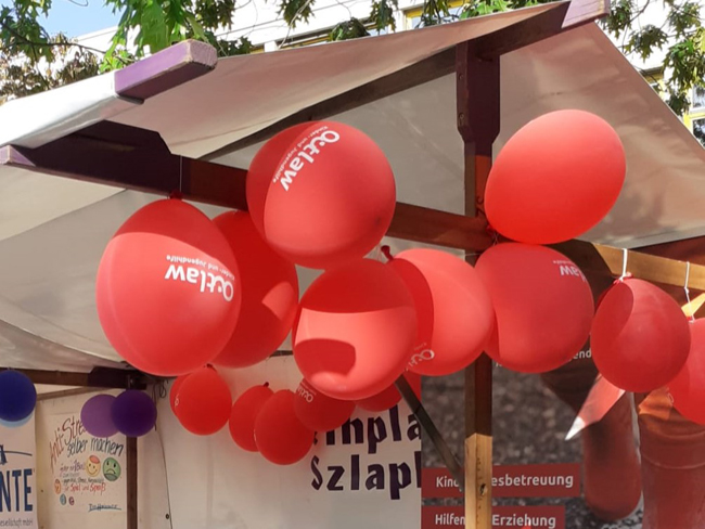 Am 8. September 2023 war es wieder soweit und das Team der Outlaw-Kita Waldshuter Zeile beteiligte sich wie jedes Jahr am beliebten Kiezfest der Rollberge-Siedlung im Berliner Stadtteil Waidmannslust. Alt & Jung erwartete tolle Aktionen, ein buntes Bühnenprogramm und vielfältig kulinarische Leckereien – angeboten von Einrichtungen aus dem Kiez und gefördert aus dem Aktionsfonds des Quartiersmanagement Titiseestraße. "Wir sind fest im Kiez verankert und freuen uns jedes Jahr mit einem Mit-mach-Angebot die kleinen und auch großen Gäste zu erfreuen", sagt Kita-Leiterin Carola von der Reith und führt weiter aus: "In dieser fröhlichen und ungezwungenen Atmosphäre können sich die Familien auch über die Angebote unserer Kita informieren." Das Fest startete um 14 Uhr und fand wie immer auf dem von Schüler:innen und Anwohner:innen vor zwei Jahren öffentlich getauften 'Popeleplatz' statt.