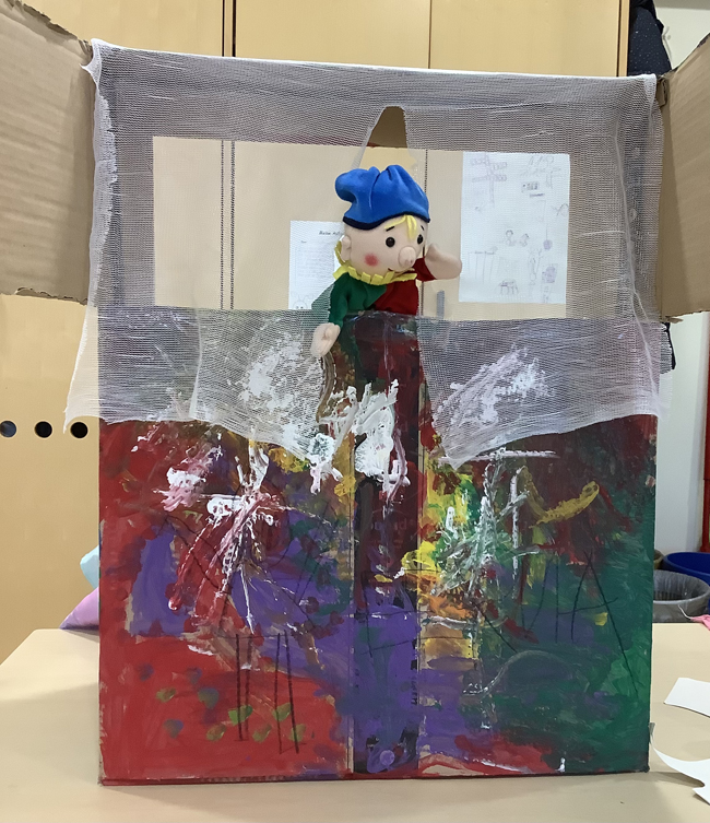 Die größeren Kinder der Forscherinsel stellten sich der Frage, was alles mit einem leeren Karton möglich ist. Gemeinsam sammelten sie ihre Ideen und einigten sich schnell darauf, den Karton bunt anzumalen. Als das schmucke Stück erst einmal fertig war, inspirierte sie das Kunstwerk zu einem Puppen-Tisch-Theater mit Tür und Vorhang. Jetzt mussten also Spielfiguren her, denn sie selbst wären ja zu groß für das kleine Theaterhaus, stellten die jungen Bühnenbildner:innen folgerichtig fest. Also tüftelten sie fleißig weiter und malten, schnitten, klebten und bastelten viele unterschiedliche Stabpuppen zu einem Spielensemble zusammen. Jetzt waren die Mädchen und Jungen als Autor:innen und Regisseur:innen gefragt, um sich erste Geschichten auszudenken und sie auf die Bühne zu bringen.