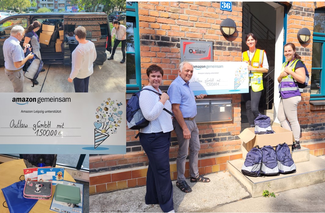 Am Montag nahmen Steffen Kröner, Geschäftsleiter Outlaw gGmbH in Halle (Saale), und Ines Herrmann, Referentin Fundraising bei Outlaw, 150 gut gefüllte Schultaschen sowie einen Scheck in Höhe von 1.500 Euro von Amazon Leipzig entgegen. Möglich macht das die Aktion „Amazon Back to School“, bei der Amazon-Mitarbeiter:innen Schulrucksäcke für sozial benachteiligte Familien packen und spenden. Vor der Outlaw-Geschäftsstelle in Halle überreichten Monika Kohlmann, Senior Operations Manager, und Nicole Heunemann aus der Personalabteilung bei Amazon in Schkeuditz die Schulrucksäcke und den Scheck; alles kommt nun den von Outlaw in Halle und im Saalekreis betreuten Familien mit schulpflichtigen Kindern und Jugendlichen zugute.