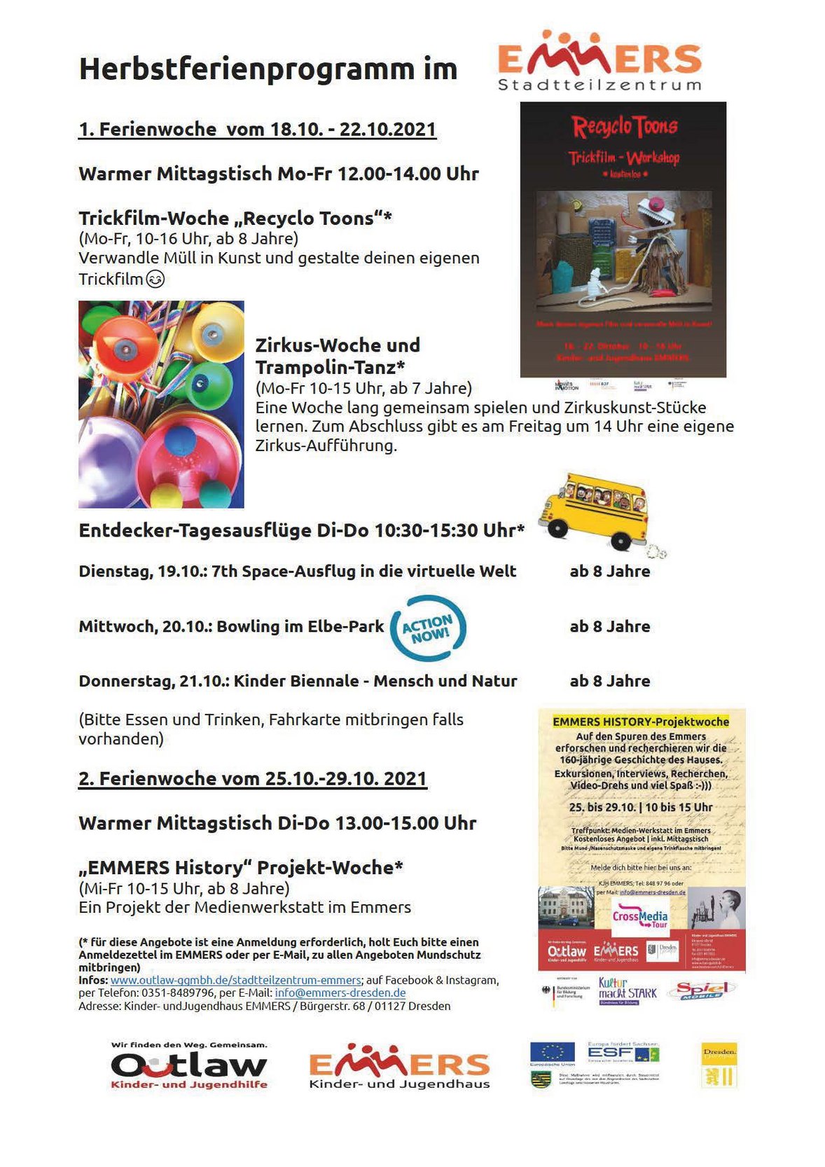 Unser Herbstferien-Programm 2021 beginnt: Auf unserer Website findet ihr alle Infos zu den geplanten Projekten und Anmeldungen. Los gehts in Woche 1 mit dem Trickfilm-Projekt "Recyclo-Toons". Wir verwandeln Müll in Kunst und gestalten unseren eigenen Trickfilm. Außerdem findet die Zirkus-Woche und Trampolin-Tanz statt. Oben drauf planen wir Entdecker*innen-Ausflüge.