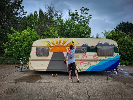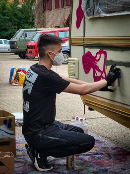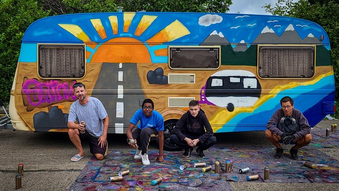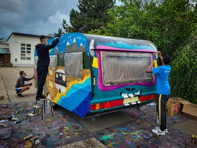 "Wir hatten einen unvergesslichen Tag mit vier talentierten Jugendlichen aus unseren stationären Einrichtungen. Trotz des teilweise leichten Regens haben wir uns entschieden, unseren Wohnwagen in ein farbenfrohes Kunstwerk zu verwandeln. Das Ergebnis war einfach atemberaubend", beschreibt Chris Gerdes rückblickend auf die "Verschönerungs-Aktion" und ist richtig stolz auf die Jugendlichen. Der Plan war, den Wohnwagen mit bunten Farben und kreativen Mustern zu besprühen: "Die Jugendlichen waren voller Energie und Ideen, als sie ihre Spraydosen in die Hand nahmen. Die Grautöne des Himmels wurden schnell durch die leuchtenden Farben ihrer Kunstwerke ersetzt", ist der Betreuer noch immer beeindruckt.