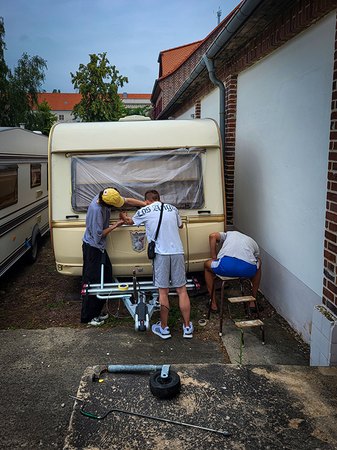 Erste Tour für den neuen Wohnwagen der HzE jugendPLUSberuf am Standort Halle/Saalekreis: Pünktlich zur HzE-Ferienakademie gehts auch für den Wohnwagen zum ersten Einsatz im Rahmen einer Ferienfahrt. Denn genau dafür ist der frisch gestylte Anhänger gedacht: Mit ihm sollen im Rahmen der Angebote am Standort Ferienfahrten, Wochenendfahrten mit Jugendlichen, kurzfristigen Auszeiten und auch „Luftveränderungen“ in Krisensituationen realisiert werden. "Wir haben den Wohnwagen im letzten Jahr dank einer Förderung des Jugendamts Halle (Saale) anschaffen können und dann gemeinsam mit Jugendlichen verschönert", beschreibt Chris Gerdes vom Team HzE jugendPLUSberuf/Team3. "Zur Ferienakademie wollen wir ihn erstmals nutzen und auch noch ein wenig die Innenausstattung auf Vordermann bringen - natürlich wieder gemeinsam mit den jungen Menschen." (Hier gehts zur Ferienakademie)