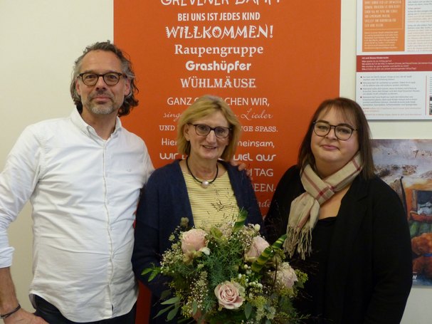 Bereits seit 30 Jahren begleitet Ulla Wienströer die Kinder der Ostbeveraner Kitas Bahnhofstraße und Grevener Damm in ihrer Entwicklung und hat dabei viel Veränderung erlebt. Zu ihrem Jubiläum gratulierten ihr Gesamtleiterin im Kreis Warendorf, Simone Mannefeld und Kitaleiter Johannes Zarend und überreichten einen Blumenstrauß und ein Geschenk.