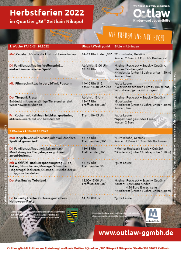 Zwei Wochen Herbstferien und unser Programm steht: Das Team der "36" im Quartier in der Nikopoler Straße in Zeithain freut sich auf euch und hat viele Angebote vorbereitet. Darunter Familienausflüge, Kegeln, Filme schauen, kochen und Kürbisse schnitzen. Hier ist bestimmt für alle etwas dabei.