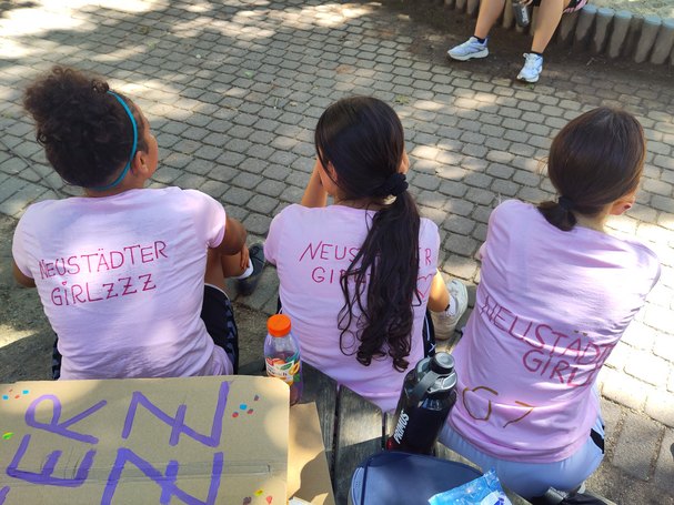 Bereits im Vorfeld hatte sich die Gruppe intensiv auf das Turnier vorbereitet. In einer Gruppenstunde gestalteten die Jugendlichen gemeinsam ihre eigenen Mannschaftsshirts. Der Tag des Turniers begann in der WG mit einem gemeinsamen Frühstück – als Stärkung für einen langen, sportlichen Tag. Anschließend ging es zu Fuß durch die Dresdner Neustadt Richtung Veranstaltungsgelände. Vor Ort: Anmeldung, Spielplan entgegennehmen, erste Kontakte knüpfen, Gelände erkunden. Insgesamt waren 13 Teams am Start – unser Team war dabei die einzige U18-Mannschaft und trat teils gegen Spielerinnen um die 20 Jahre an.