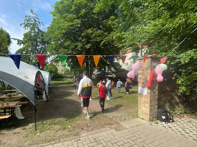 Mit mehr als 50 Gästen feierten am 16. Juni 2023 das Team und die Kids der Kinder-WG "Kruke" in Halle (Saale) das 10. Jubliäum der Einrichtung am Standort Halle/Saalekreis. Die insgesamt acht Kinder und sieben pädagogische Fachkräfte der Einrichtung in der Dieselstraße empfingen im Garten die geladenen Gäste, darunter Eltern und Freunde, Familienangehörige, auch ehemalige Klient:innen sowie Kolleg:innen anderer Einrichtungen am Outlaw-Standort und natürlich Kooperationspartner:innen. Das Programm des Festes hatten vor allem die Kinder und die Mitarbeiter:innen der Wohngruppe vorbereitet - Highlight war eine selbst choreografierte und einstudierte Tanzeinlage der Kinder.