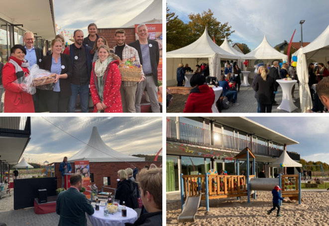 Nach feierlichen Reden zum Einstieg, gab es Gelegenheit, die Kita zu besichtigen: die Pädagog*innen führten die Gäste in kleinen Gruppen durch die gesamte Kita, die so einiges zu bieten hat. Neben Ruhe-, Sport- und Kreativräumen schmückt auch ein überdachter Balkon die Einrichtung. Dieser ermöglicht auch einen Aufenthalt draußen bei Regen. Als Highlight führt vom ersten Stock eine Tunnelrutsche direkt in den Garten. Zur Stärkung gab es ein abwechslungsreiches Buffet und die Kids spielten am Glücksrad oder ließen sich von einer Zauberin in ihren Bann ziehen.