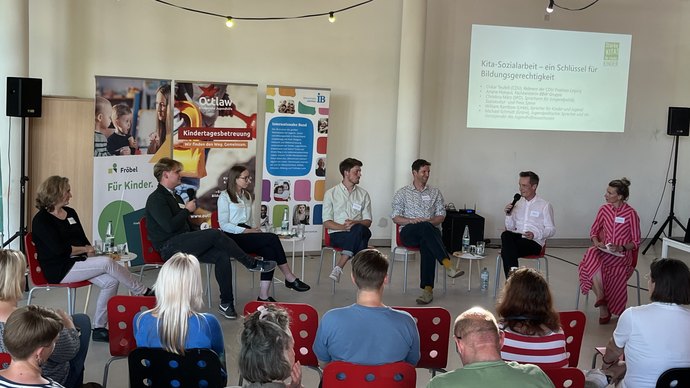 Mehr als 50 Gäste diskutierten am 28. Mai 2024 in der Kita Kleine Füchse der Kindervereinigung Leipzig über aktuelle Herausforderungen und zukünftige Anforderungen an die Kita-Sozialarbeit in Sachsen bei der Veranstaltung „Kita-Sozialarbeit als Weg aus der Krise“. Eingeladen hatte das Kita-Bündnis „Starke Kitas für Leipzig“. Durch die Diskussionsveranstaltung führten Nora Schönberg von Outlaw und Michael Kuhl von Fröbel; organisiert wurde die Veranstaltung von Outlaw, dem Internationalen Bund Leipzig sowie Fröbel.