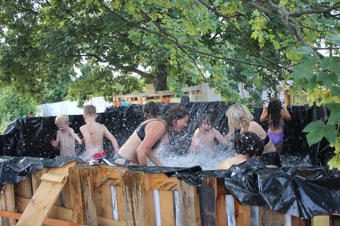 Vor Ort werkelten die Kids ganz nach dem diesjährigen Motto: „Hier kannst Du mit anderen umsetzen, was dein Kopf sich ausdenkt“ – und bei zwei Wochen praller Sonne drehte es sich dabei vor allem um Abkühlung. „Ich glaube, so viele Pools hatten wir noch nie“, lacht Elisa Winkler und zählt am Ende einen großen und sieben kleine Erfrischungsbecken, eine Wasserrutsche und einen handbetriebenen Ventilator. Neu war auch die Gestalt des Versammlungsorts, der Große RAZ: Diesen bauten die Kinder dieses Jahr nicht als Tribüne, sondern ganz locker mit Tüchern, Matten und vom Hygienemusem nebenan gespendeten Sitz-Würfeln. „Diese konnten sich alle KITRAZZA-Bürger:innen so verteilen, wie es zu ihnen passt und so selbst bestimmen, wie ihr Versammlungsort aussehen und wirken soll“, erklärt Elisa Winkler.