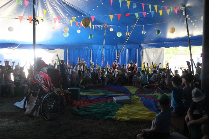 Vorher nahm der TraumZauberer die Kinder im großen RAZ-Zelt mit auf seine TraumZauberreise und fragte nach ihren Wünschen für die Stadt. : Brücken, Straßen, viele verschiedene Läden, ein Schwimmbad, Ein- und Mehrfamilienhäuser und vieles mehr soll entstehen.