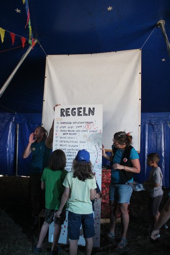 So funktioniert KITRAZZA: Auf einem Gelände mit Wiesen und Bäumen entsteht die Stadt aus Zelten, Bauwagen und Holzhütten. Während des Aufbaus werden eine Werkstatt, alle Medienanschlüsse, eine Küche, Sanitäranlagen und ein umfangreiches Lager errichtet. Den Kindern stehen dann Erwachsene zur Seite, die beim Umsetzen der Ideen und Wünsche helfen. Das Kernstück ist der „Große RAZ“, die tägliche Bürger:innenversammlung der Kinderstadt. Hier wird diskutiert, geplant und verworfen. Welches „Gesicht“ KITRAZZA bekommt, bestimmen die Kinder jedes Jahr neu.