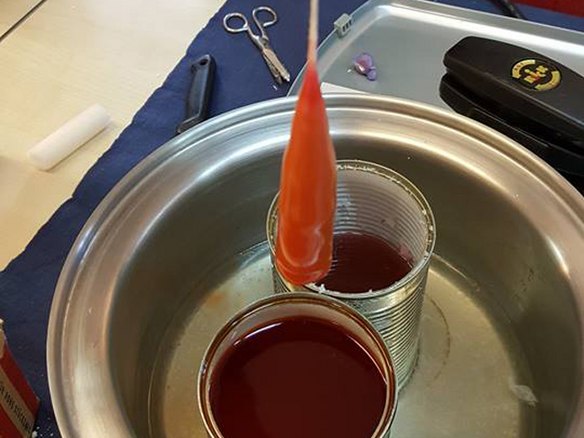 Zum Einsatz kam nicht das damals übliche und teure Bienenwachs, sondern fertige Kerzen, die sie erst einmal in gesäuberten Konservendosen eingeschmolzen haben – eine kostenfreundliche Lösung und alte Reste werden auch verbraucht! "Das Wachs muss nur richtig flüssig sein, sonst kommen ganz andere nicht weiter beeinflussbare Ergebnisse heraus", erzählt Max Röhr.