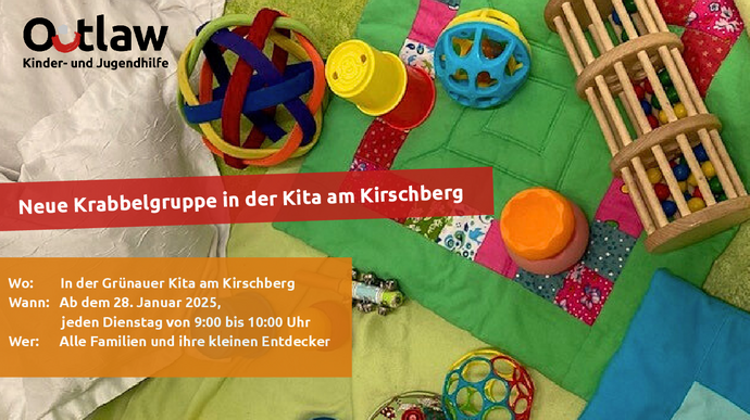 Wir laden alle Familien mit ihren Kindern in unsere neue Krabbelgruppe in die Grünauer Kita am Kirschberg ein. Ab dem 28. Januar 2025 treffen wir uns jeden Dienstag von 9:00 bis 10:00 Uhr, um uns kennenzulernen, miteinander zu spielen und die ersten Schritte in Richtung Kita-Welt zu wagen. Das Angebot ist für alle Familien kostenlos. Unsere Kita-Sozialarbeiterin und eine Krippenerzieher:in begleiten die Stunde, beraten Sie und stehen Ihnen für alle Nachfragen zur Verfügung.