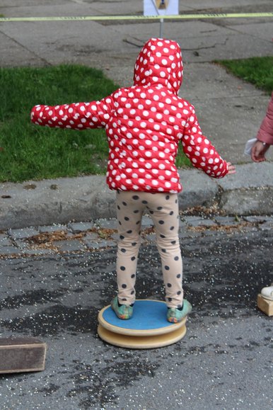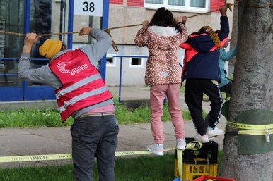 "Wir ließen die Hochschulstraße zwischen Lutherstraße und Reichenbachstraße sperren", berichtet Judith-Maria May vom Spielmobil. "Und da wir kein Anwohner*innenfest veranstalten konnten, luden wir die Kinder der 5. und 6. Klassen der 46. Oberschule sowie den Hort der 117. Grundschule in Dresden ein." Das Spielmobil-Team um Silvana Zühlke, Christoph Litzki und BA-Studentin Alina Bothe boten den Mädchen und Jungen verschiedene Möglichkeiten, darunter einen Parcours zu durchlaufen, Trampolin zu springen, auf der Rollenrutsche die Straße runter zu sausen, eine Murmelbahn selber zu bauen und Straßenspiele auszuprobieren.