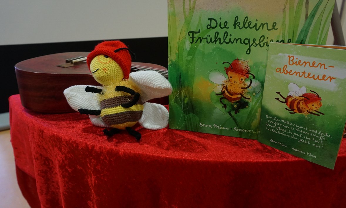 „Bienchen Millie staunt und lacht, Neugier neues Wissen schafft. Drum fliegt sie noch ein Stück – na los, kommt ihr gleich mit?“ leitete Enna Miau die interaktive Lesung ein und die Kinder der Kita Hechtstraße hörten aufmerksam zu.