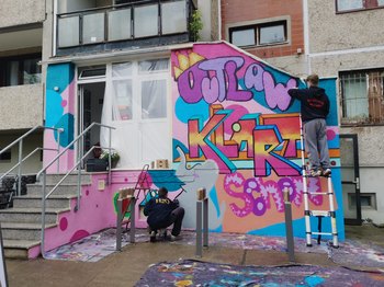 In den letzten Tagen der Woche ging es dann ans Eingemachte: Die triste, graue Außenwand bekam endlich Farbe. Der Spruch „Outlaw klärt schon“, ist im Rahmen der Ferienakademie 2020 durch die Jugendgruppe entstanden und steht für den lösungsorientierten Ansatz, den sie in der Hilfe erfahren. Denn selbst wenn Situationen ausweglos erscheinen, finden wir den Weg gemeinsam.