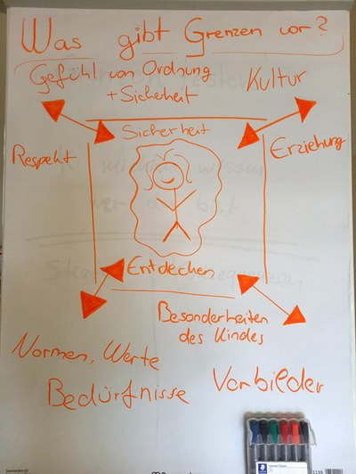 Was gibt die Grenzen vor – wie verhält es sich mit dem Gefühl nach Ordnung und Sicherheit und einem freien Entdecken der Welt, welche Bedürfnisse hat ein Kind und welche Vorbilder kennen die Erwachsenen und welche wollen sie selbst sein? Bei dem Gespräch ging es auch darum, wie die eigene Kindheit und Kultur in das Hier und Jetzt einfließen.