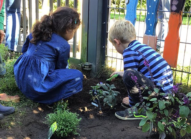 Gemeinsam sammelten alle Ideen – dabei war es ihnen wichtig sich etwas zu wünschen, dass zusammen mit ihnen wächst. Nach langem Überlegen entschieden sich die Mädchen und Jungen demokratisch für ein neues Blumenbeet, das sie im Garten der Kita anlegten. Neben einigen winterharten Blumen schmücken auch Kräuter wie Thymian, Zitronenmelisse, Basilikum und Lavendel das neue Beet.
