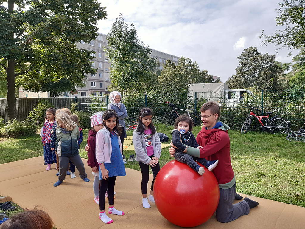 Eingeladen waren nicht nur alle Kinder der Gemeinschaftsunterkunft, die noch keinen Kitaplatz haben, sondern auch die Vorschulkinder der Kita-Karl-Heine Straße, um täglich gemeinsam vormittags auf der Freifläche der GU Zirkusluft zu schnuppern. Zusammen probierten und entdeckten alle Kinder die verschiedenen Zirkusmaterialien. Es wurde viel balanciert, jongliert, gelacht und getanzt.