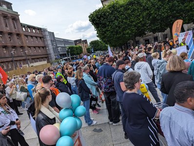 Mehr als 500 Eltern, Kinder, Mitarbeitende aus den OGS und weitere Unterstützer:innen folgten gestern unserem Aufruf zur Kundgebung vor dem Bochumer Rathaus und machten lautstark auf die schlechte finanzielle Situation der OGS aufmerksam. Aus diesem Grund fand auch keine Betreuung in unseren OGS Dahlhausen, OGS Regenbogenschule und die OGS Schule Am Volkspark statt. Gemeinsam mit den Trägern der Freien Wohlfahrtspflege und in Kooperation mit dem Schulreferat der evangelischen Kirche hatte Outlaw zur Kundgebung aufgerufen, um auf die dramatische finanzielle Lage in Bochum hinweisen. Denn die OGS stehen auf der Kippe - und damit die zuverlässige Betreuung der Kinder nach Schulschluss.
