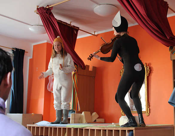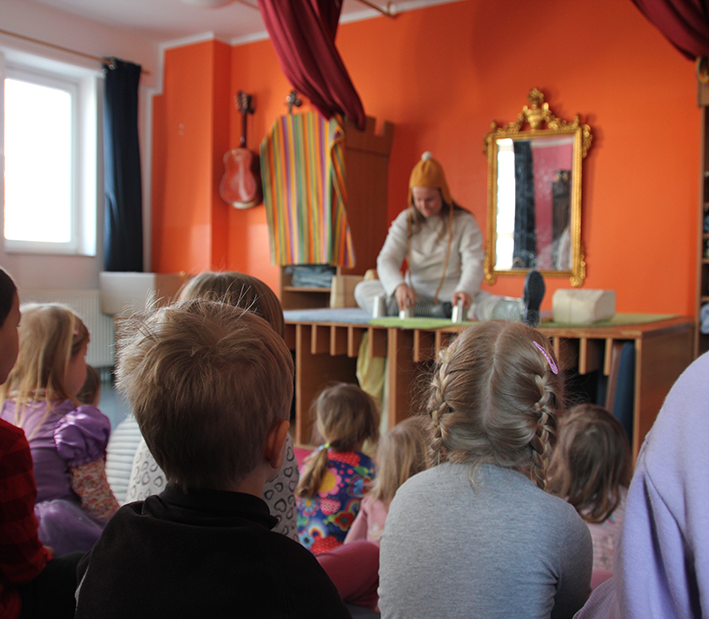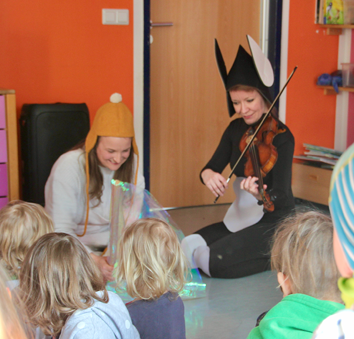 Bereits im Vorfeld erhielten unsere Pädagog:innen eine Materialsammlung, um mit passendem Fingerspiel sowie einer Kurzgeschichte die Kinder auf das Musiktheater vorzubereiten. Voller Vorfreude erwarteten sie die Akteurinnen im kitaeigenen Theaterraum – aufmerksam schauten die Kleinen dem Schauspiel zu und lauschten mit gespitzten Ohren den Liedern und Geigen-Klängen. Immer wieder bezogen die Bühnenkünstlerinnen dabei die Mädchen und Jungen ein – gleich zu Beginn zum Beispiel riefen unsere Kids die beiden Darstellerinnen mit dem notwendigen Zauberspruch herein. Im Anschluss kamen die Kinder noch mit ihnen ins Gespräch und stellten Fragen.