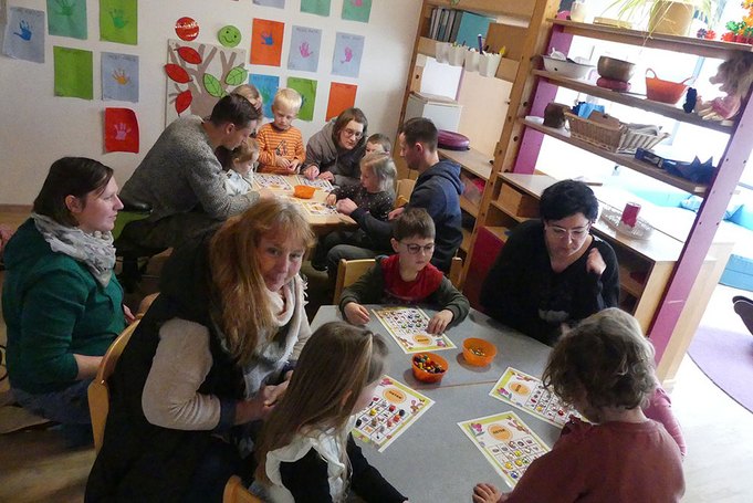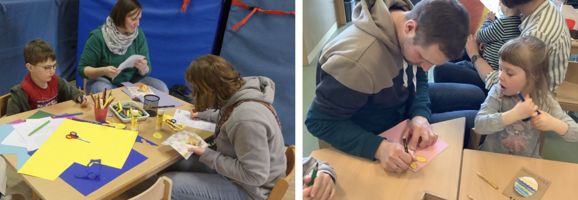 Passend zum Osterfest waren die Spielkarten anstelle von Zahlen mit kindgerechten Bildersymbolen zum Thema Ostern gestaltet. Nachdem die Kids in zwei Gruppen eingeteilt wurden, konnte das Spiel auch schon anfangen: Je Gruppe bestand die Möglichkeit 3 Runden zu spielen mit je 3 Hauptpreisen – für alle Kinder gab es auch einen kleinen Trostpreis. Die Kleinen haben zudem mit ihren Eltern Osterpostkarten gebastelt. Zu Kaffee und selbstgebackenem Kuchen saßen alle Familien gemütlich und plaudernd zusammen.