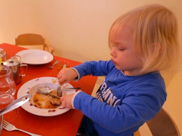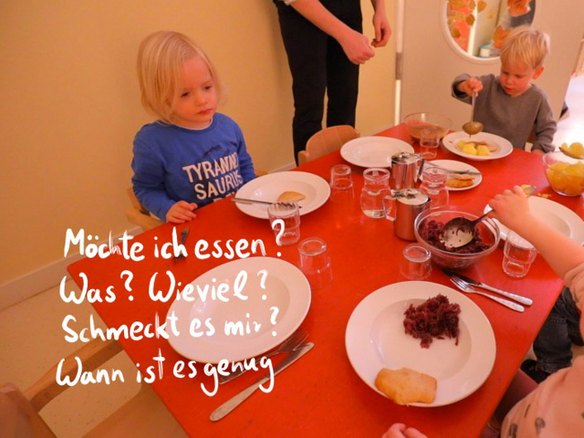 Essenszeit in der Berliner Outlaw-Kita Wundtstraße. Ein Junge steht etwas unbeholfen neben einen von Kindern belegten Tisch. Ist er noch hungrig, obwohl er schon gegessen hat? Was ihn beschäftigt, ist im Film "Partizipation im Kita-Alltag - ein Beispiel" zu sehen – ein Film im Auftrag des Paritätischen Gesamtverbandes und des Bundesministeriums für Familie, Senioren, Frauen und Jugend.