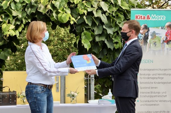 Gemeinsam mit Sachsens Ministerpräsident Michael Kretschmer brachte Kita-Leiterin Katja Hillenbrand heute die Plakette des Deutschen Kita-Preises an der Dresdner Kita-Rehefelder Straße an. Denn die Pieschener-Einrichtung wurde im Juni mit dem 2. Platz des Deutschen Kita-Preises 2020 prämiert und erhielt nun von der Deutschen Kinder- und Jugendstiftung (DKJS) die offizielle Auszeichnung. Dazu gab es den Scheck über 10.000 Euro, die Urkunde und natürlich Medaillen für die wichtigsten Personen rund um den Kita-Preis: die Kinder der Kita!