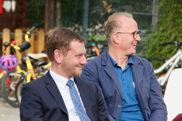 Neben Sachsens Ministerpräsident kamen u. a. Barbara Klepsch (Staatsministerin für Kultur und Tourismus), Jan Donhauser (Dresdens Bildungsbürgermeister), Jens Hoffsommer (Leiter Deutsche Kinder- und Jugendstiftung in Sachsen & Thüringen), Carsten Schöne (Regionalleiter Deutscher Paritätischer Wohlfahrtsverband LV Sachsen e. V. ) sowie Vertreter*innen des Elternrats und Fördervereins der Kita und gratulierten persönlich zu diesem besonderen Preis.