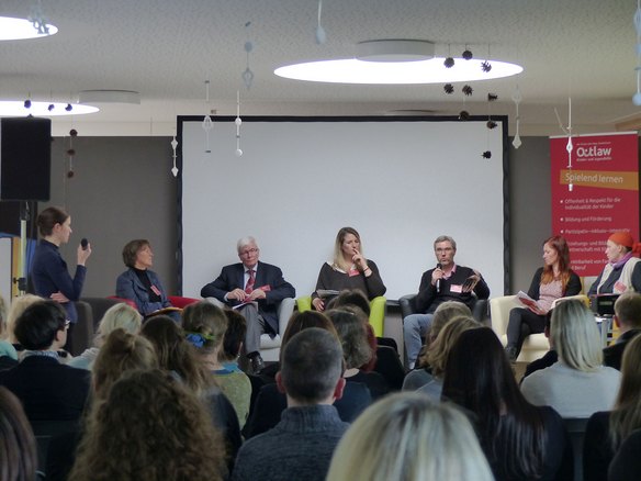 Auf dem Podium nahmen dann erneut die Vertreter*innen der Politik, Verwaltung und Jugendhilfe sowie die Outlaw-Sozialarbeiterin Bianca Baumgärtel und eine Mutter aus der Kita Hildegardstraße Platz. Moderiert von Vicki Felthaus, Der Paritätische in Leipzig, diskutierten die Gäste, was Kita-Sozialarbeit leisten kann und was umgesetzt werden muss, um Kita-Sozialarbeit als essentielle Schnittstelle zwischen Jugendamt, Kitas, Eltern sowie Beratungsstellen zu etablieren.