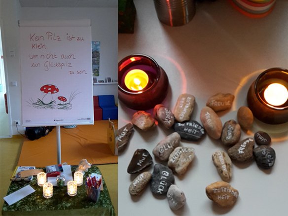 Unter dem Thema 'Achtsamkeit & Fürsorge' standen die pädagogischen Fachkräfte und ihre eigene Persönlichkeit im Mittelpunkt der beiden Tage. Was läuft gut? Was könnte besser sein? Was kann ich persönlich tun? Was brauche ich um bestimmte Punkte zu ändern? Was ist wichtig für mein Team? In Gruppen arbeiteten sie unter den Aspekten "Weiter so – so bitte nicht" Punkte heraus und verarbeiteten sie kreativ zu einer Ausstellung. Übungen wie ein Spaziergang zu zweit sollten durch das gegenseitige Zuhören bei der Selbstreflexion unterstützen. Als gemeinsamen Abschluss entzündeten sie Kerzen mit Wünschen für die Zukunft.